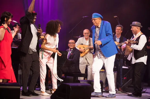 Esperanza Spalding, third from left, and Chucho Valdes, third from right, share a moment at the International Jazz Day concert in Havana on April 30, 2017.From the opening number of the sixth Internat...