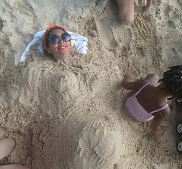El domingo, Beyonc public en Instagram una foto suya cubierta de arena, con un vientre sospechoso.La imagen parece mostrar Blue Ivy sentada junto a su madre sonriente, durante un da lindo de la playa ...